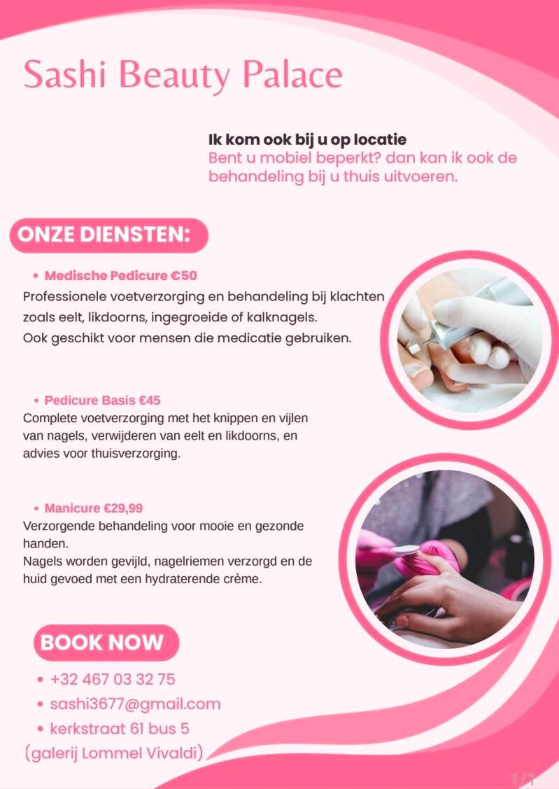 Welkom bij Sashi Beauty , waar we geloven dat schoonheid een keuze is, de jouwe! Ontdek een wereld van gepersonaliseerde verzorging voor elk huidtype en geniet van onze unieke medische pedicure, zelfs comfortabel bij jou thuis. Laat je verwennen en straal van binnenuit.